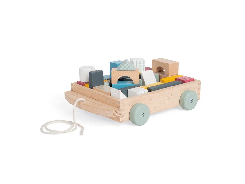 Tento vozík s kockami v pastelových farbách poteší každé dieťa. Je vyrobený z prvotriedneho, udržateľného dreva s certifikáciou FSC® a je farbený netoxickými farbami a lakmi.