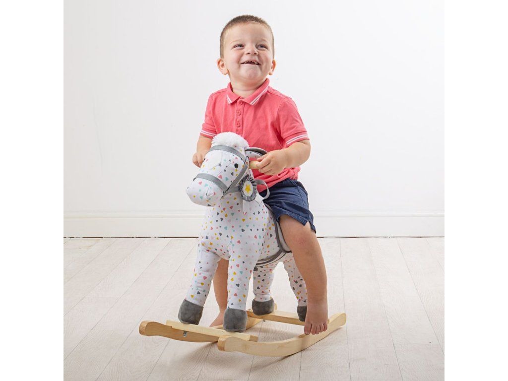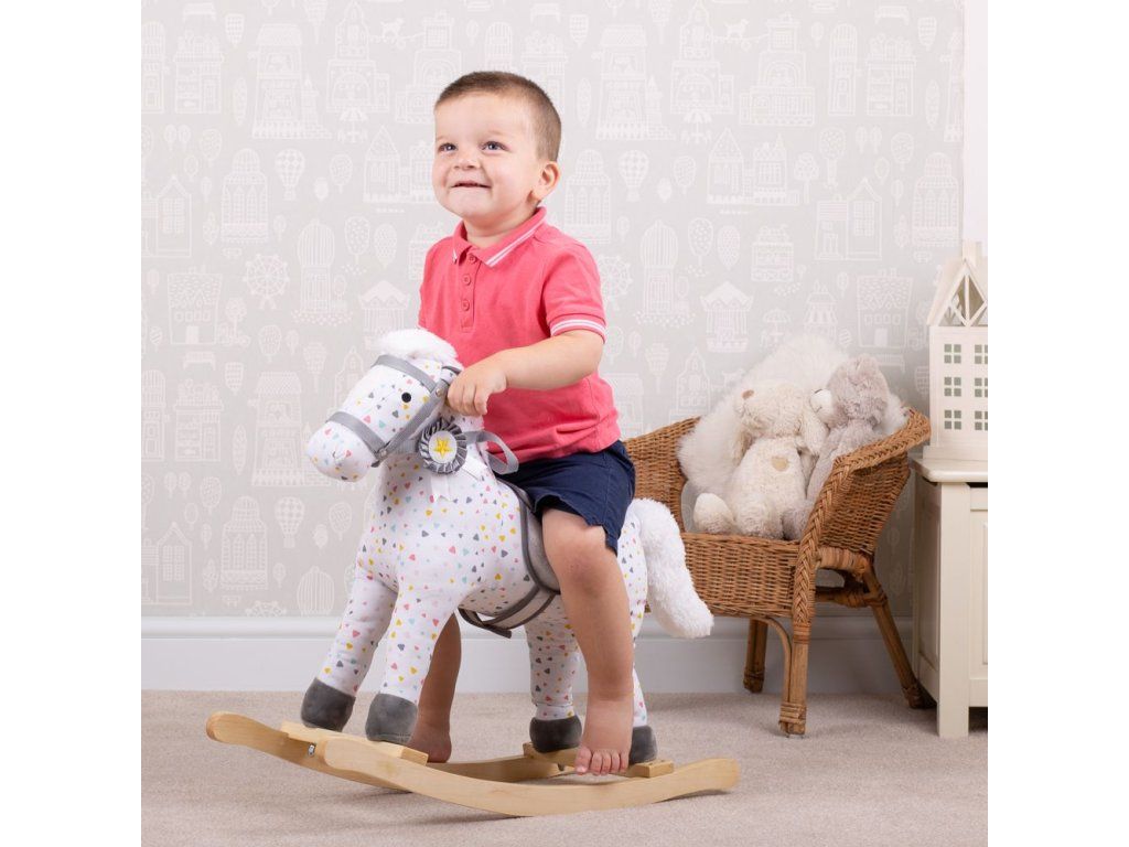 Vyrazte na jazdu! Tento nádherne vyrobený drevený hojdací kôň má krásny vzorovaný dizajn, mäkké sedlo a uzdu.