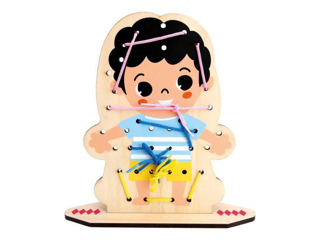 Klasická hračka s obojstranne potlačenou drevenou doskou umožňuje deťom hrať sa kdekoľvek a kedykoľvek. Navliekanie pomocou šnúrky podporuje dlhodobú a sústredenú hru.