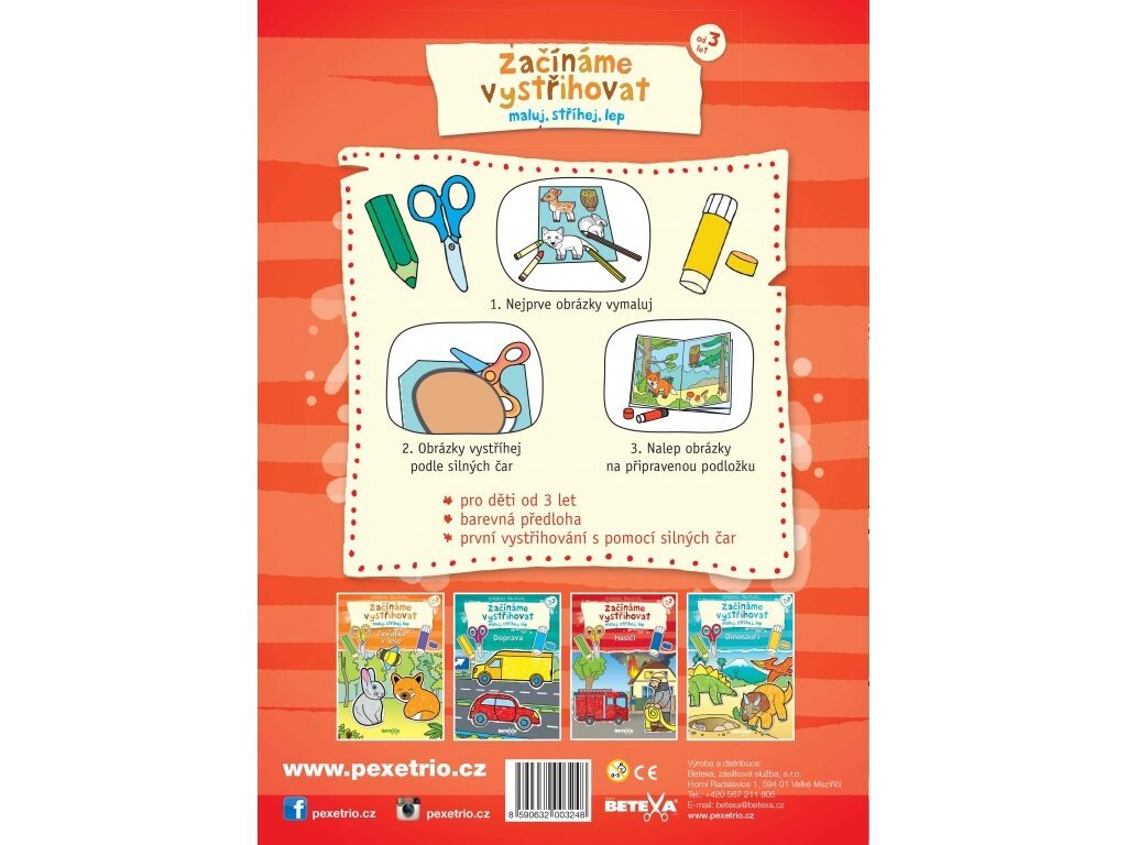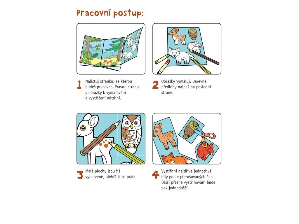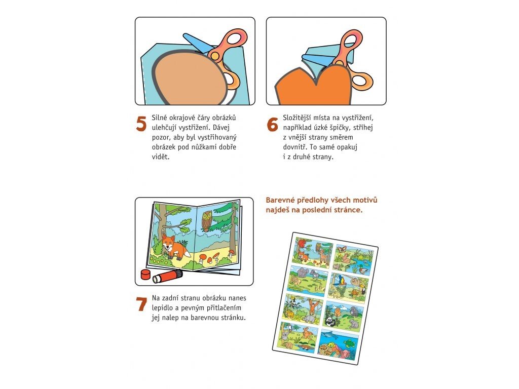 Novinka pre úplných začiatočníkov: deti najprv vystrihnú jednotlivé diely skladačky a potom ich nalepia do predtlačených predlôh. Orientujú sa pomocou očíslovania jednotlivých dielikov a podľa farebnej predlohy.