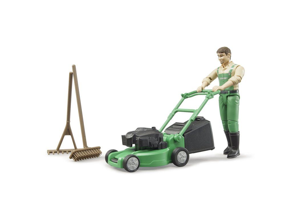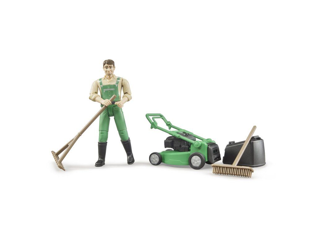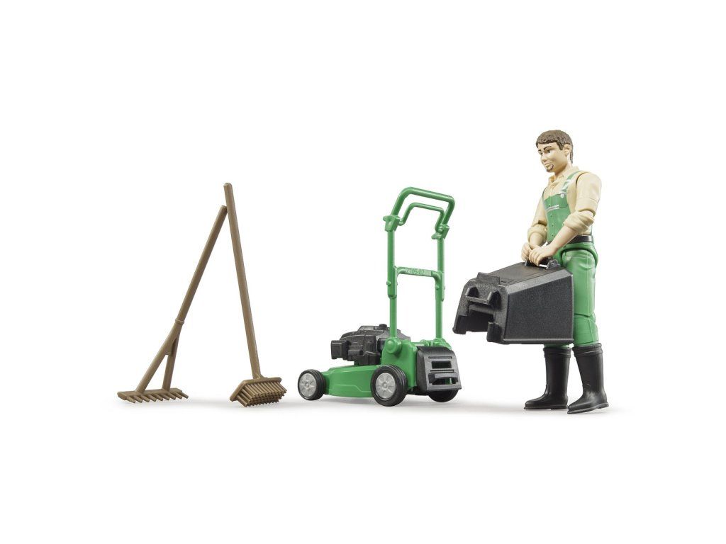 Súčasťou balenia sú hrable a metla. Kosačka má odnímateľný kôš na pokosenú trávu a pohyblivú rukoväť nastaviteľnú pre figúrku Bruder, čo zvyšuje realistickosť hry.