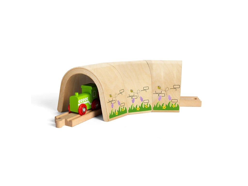 Tunel je možné aranžovať do rôznych kombinácií podľa fantázie dieťaťa – ako jednoduchý rovný tunel s otočením o 180° alebo spojením štyroch tunelov vytvoriť oblúkový tunel kompatibilný s Long Curve Track. Vyrobené z robustnej preglejky s unikátnym prírodným povrchom.