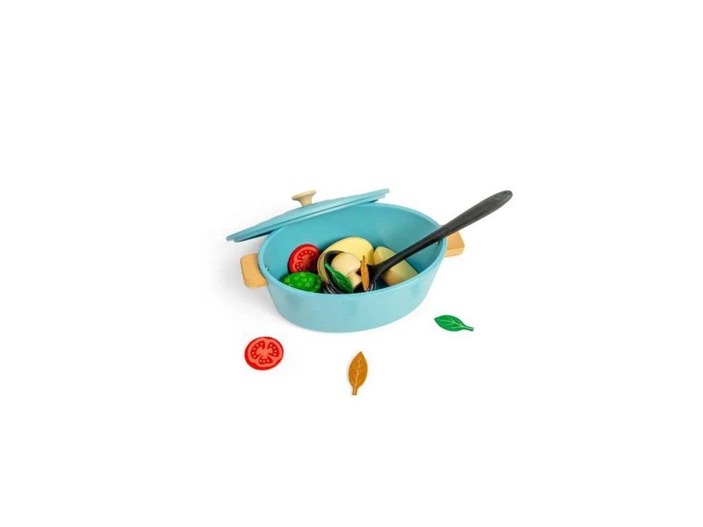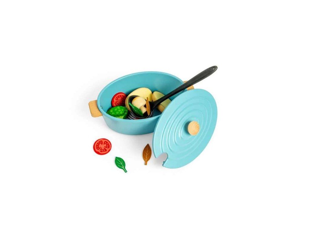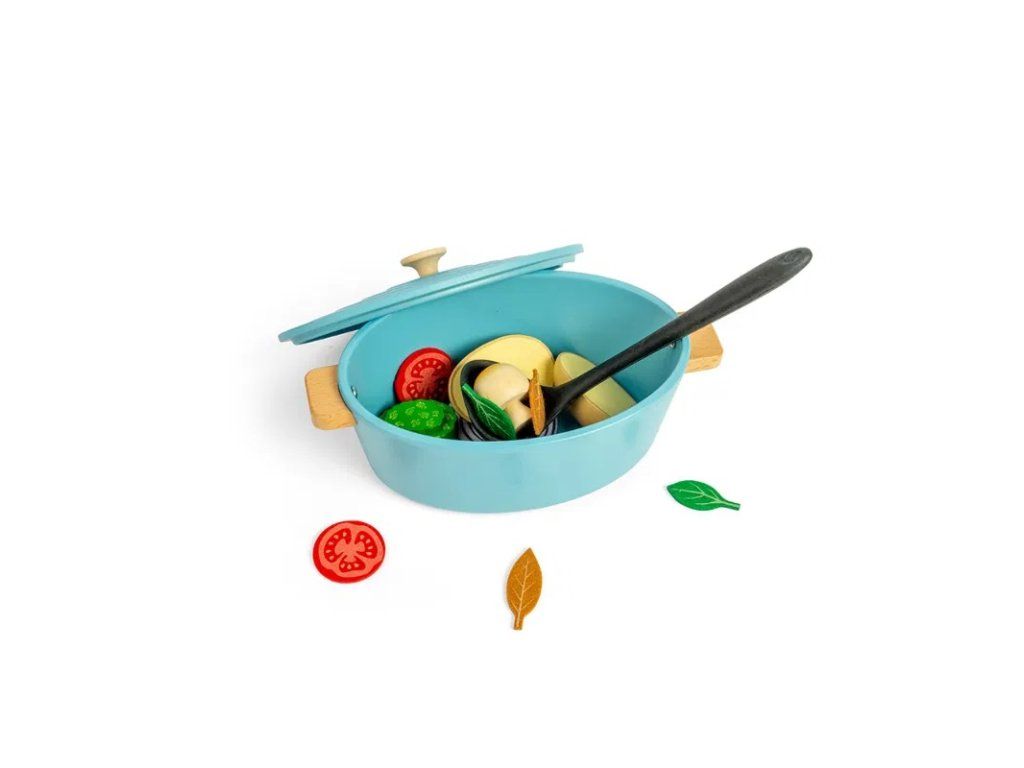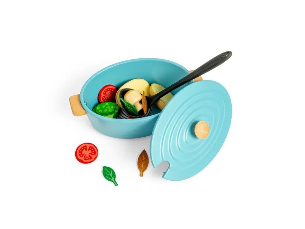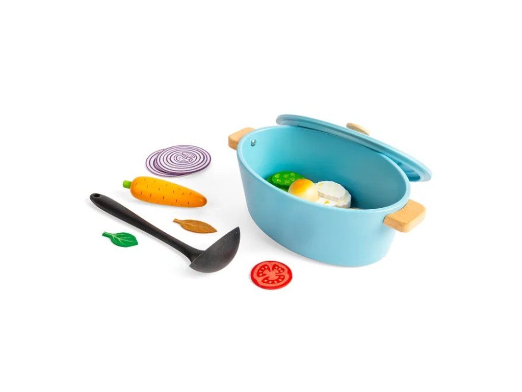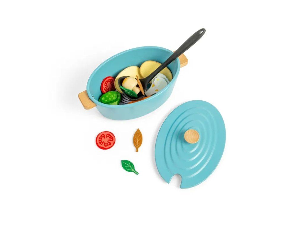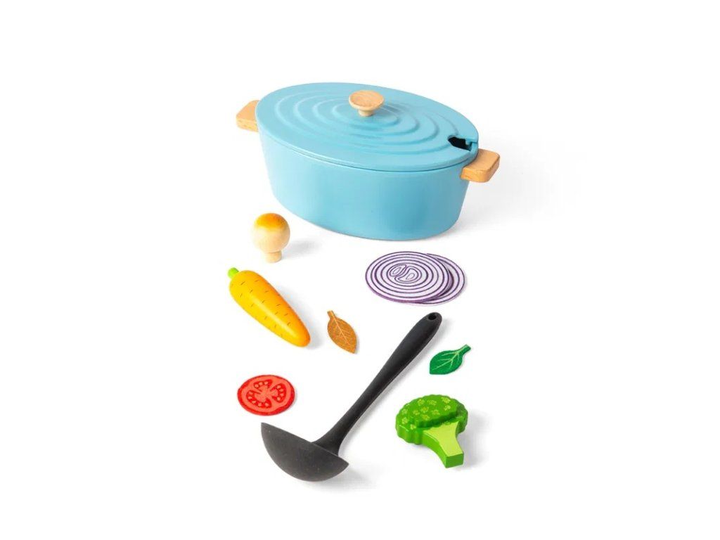 Súčasťou sady je viacero druhov drevenej zeleniny, ako cibuľa, brokolica, paradajky a ďalšie, spolu s naberačkou na jednoduché servírovanie. Prostredníctvom nápaditej a tvorivej hry môžu deti rozvíjať sociálne zručnosti, jazyk, komunikáciu, kreativitu aj sebavedomie. Zároveň sa zoznamujú s rôznymi druhmi potravín a učia sa princípom vyváženej a zdravej stravy.