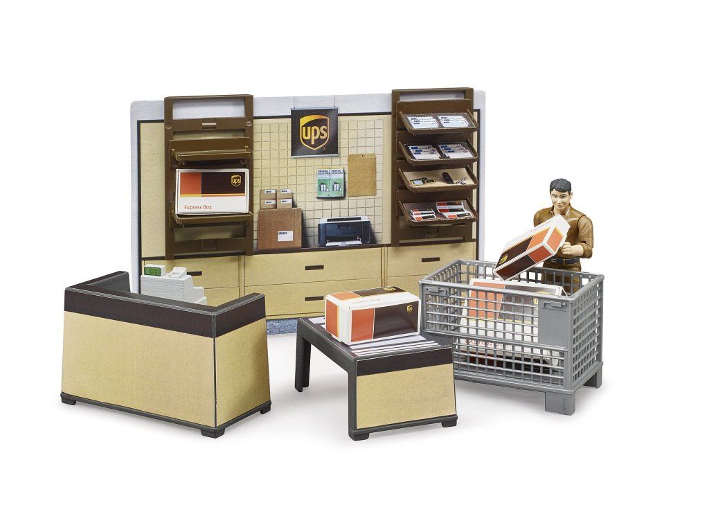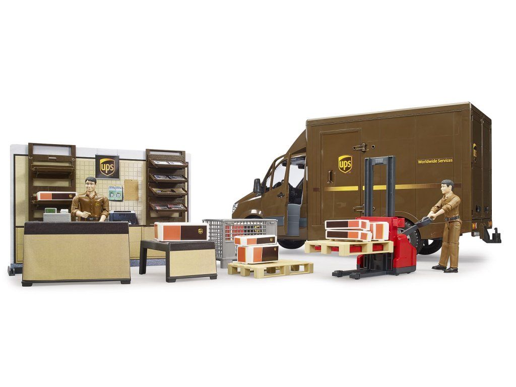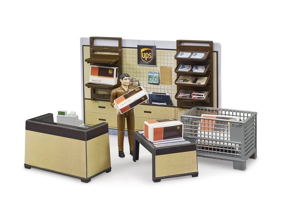 Zásielkovňa UPS od spoločnosti BRUDER s vybavením a figúrkou prináša realistický svet doručovacích služieb do detskej hry.