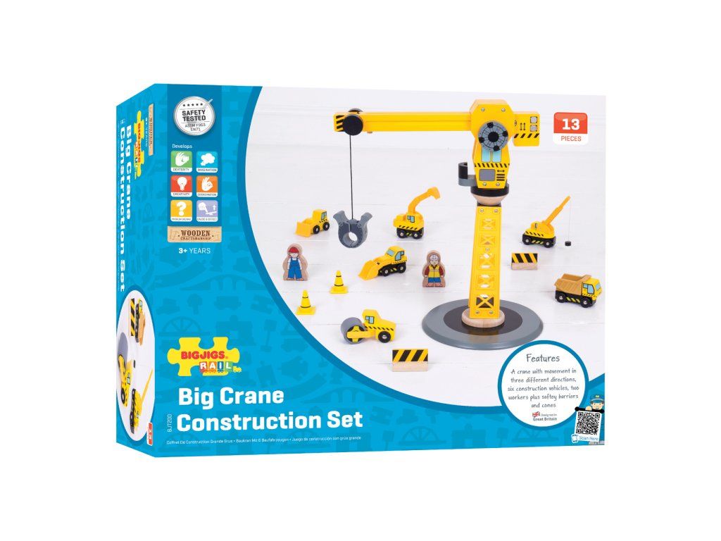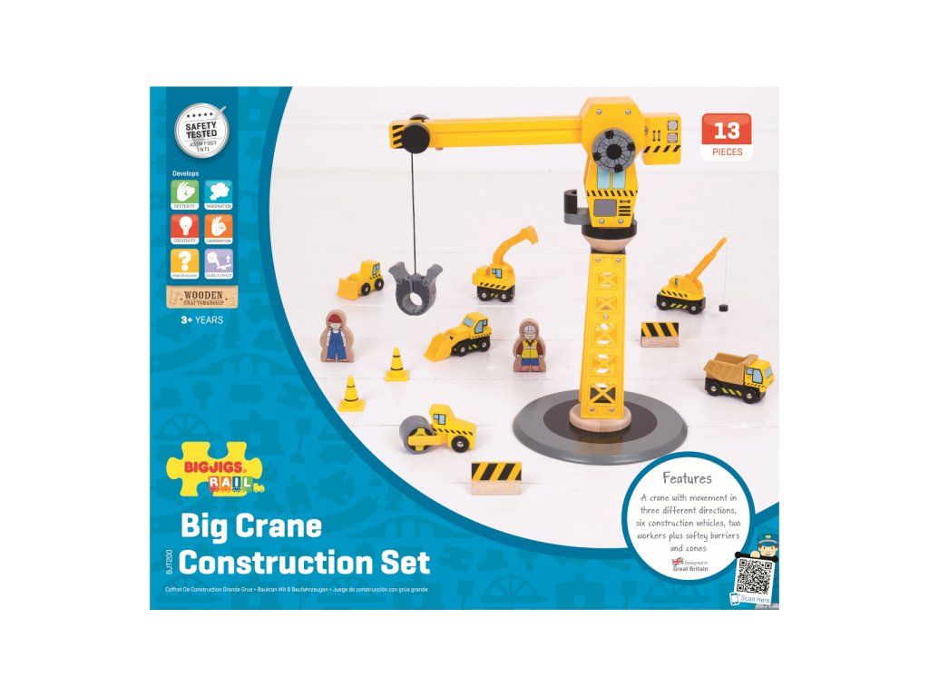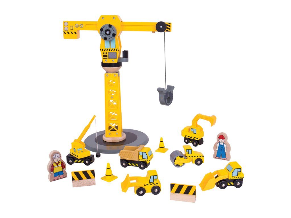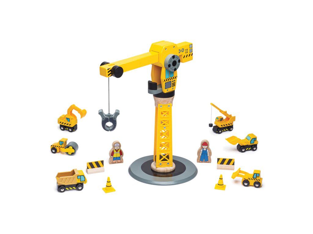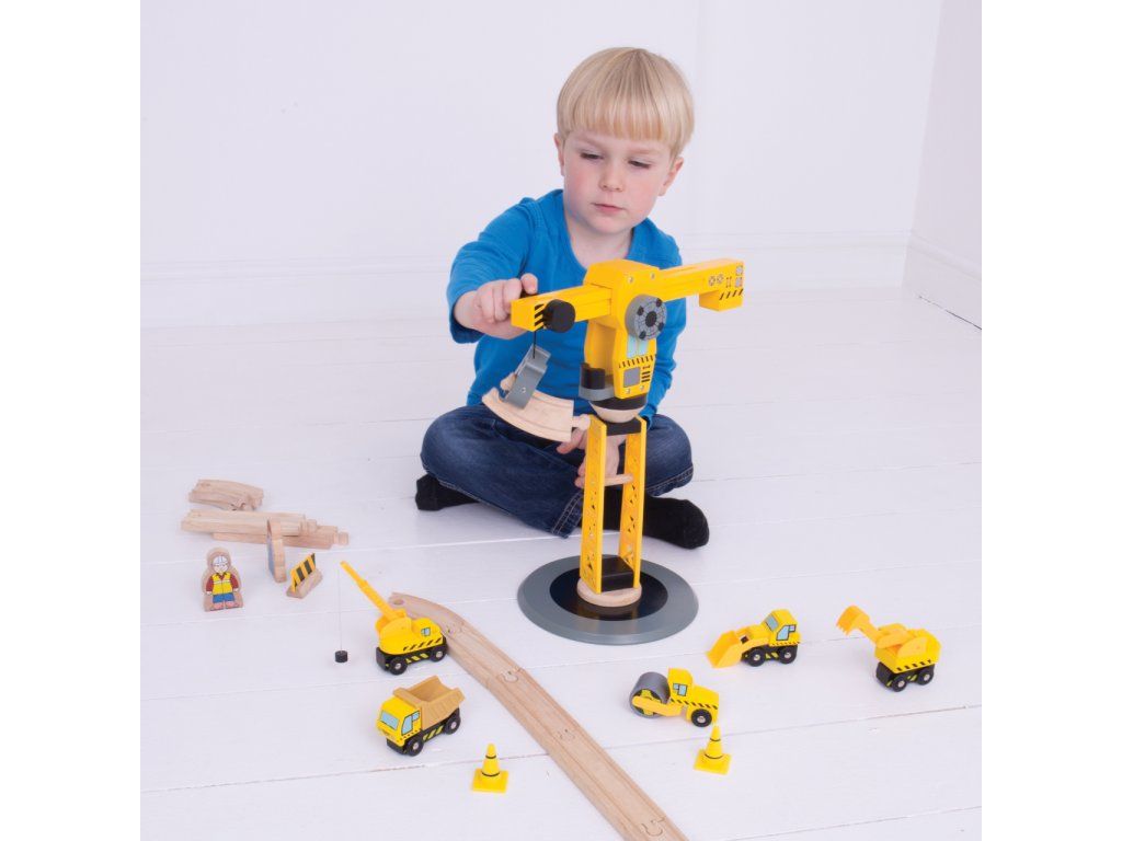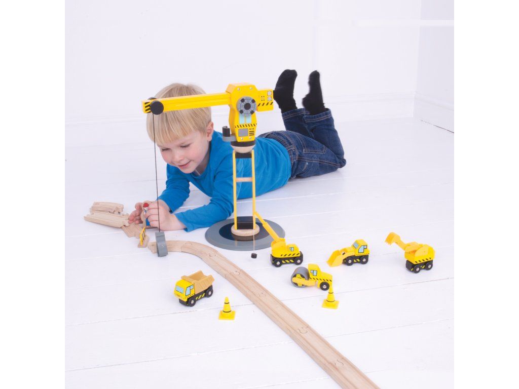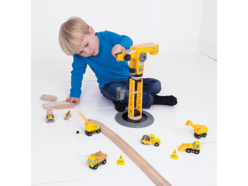 Ideálny darček pre každé dieťa, ktoré má drevenú vláčikodráhu alebo má rado stavebné stroje! Táto sada obsahuje veľký žeriav, niekoľko rôznych stavebných strojov, dvoch pracovníkov, kužele a zábrany – všetko ideálne pre nápadité hry. Deti sa s touto hračkou nikdy nebudú nudiť!
