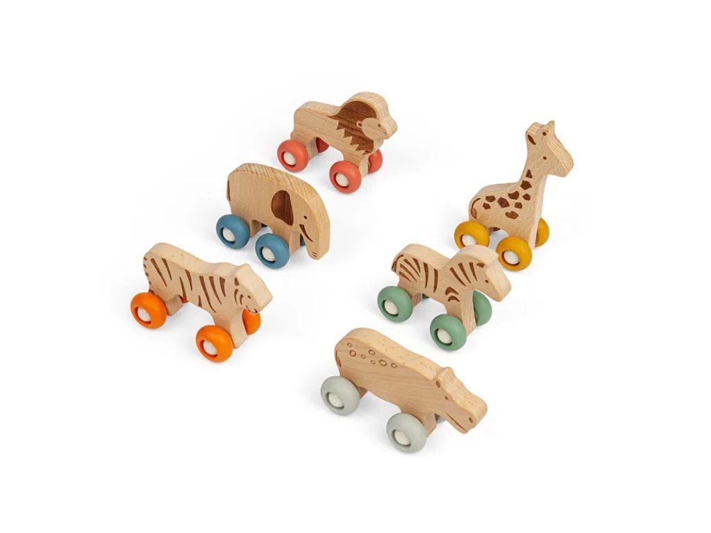 Pripravte sa na dobrodružnú jazdu so zvieratkom na kolieskach v prírodnom drevenom vzhľade so štyrmi farebnými kolieskami. Zvieratko má výrez pre jednoduché uchopenie malými detskými ručičkami.